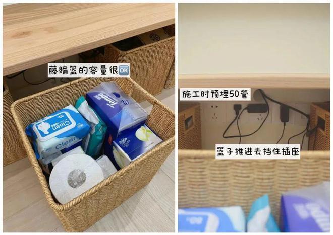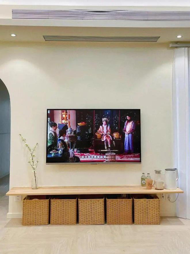 像网友@十一和十二:就网购了一块橡木搁板+5个藤编筐改造了一个极简电视柜,总成本才700块。