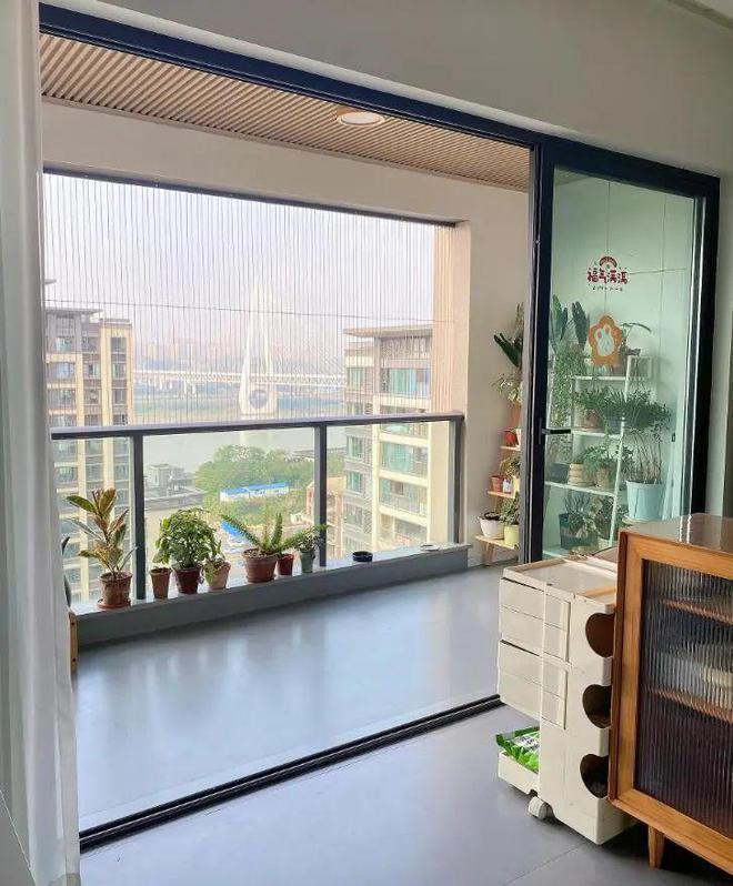 2)移门封阳台:若客厅移门尺寸和阳台差不多,可以用移门封阳台,同样可以达到省钱的目的,并且视野和通风都很好。